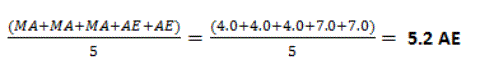 Three scores of 5, 5, 8 average to: 6.0 AE; (5 + 5 + 8)/3 = 18/3 = 6.0